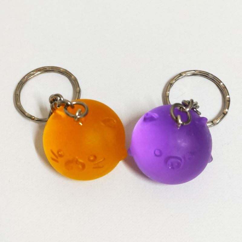 サイズ:縦約8cm(紫ブタ,オレンジ猫部分約2.5cm)、横約3cm、重さ約15g(各)。