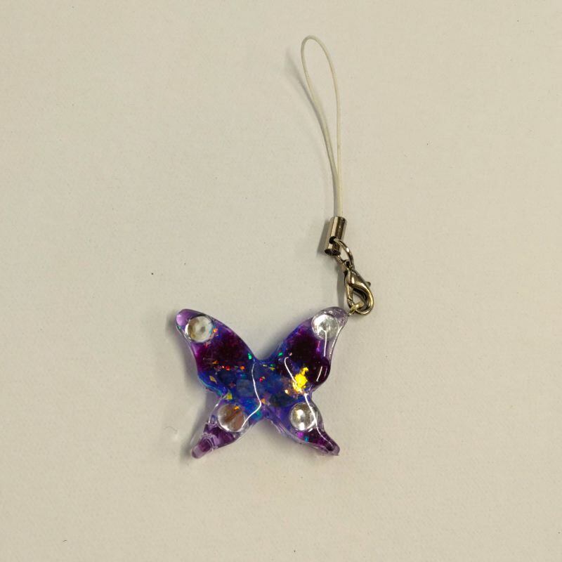 紫の蝶のストラップは、エレガントな紫色にラメをあしらった美しい蝶のデザインが特徴のストラップです。このストラップを使うことで、あなたの日常に華やかなアクセントを添え、特別な存在感を放ちます。 自分用はもちろん、友人や家族への素敵なプレゼントとしても喜ばれることでしょう。上品で魅力的なアクセサリーをお探しの方に、ぜひお選びいただきたい一品です。 サイズ:縦約9.5cm(蝶部分約3cm)、横約3cm、重さ約5g。